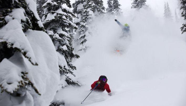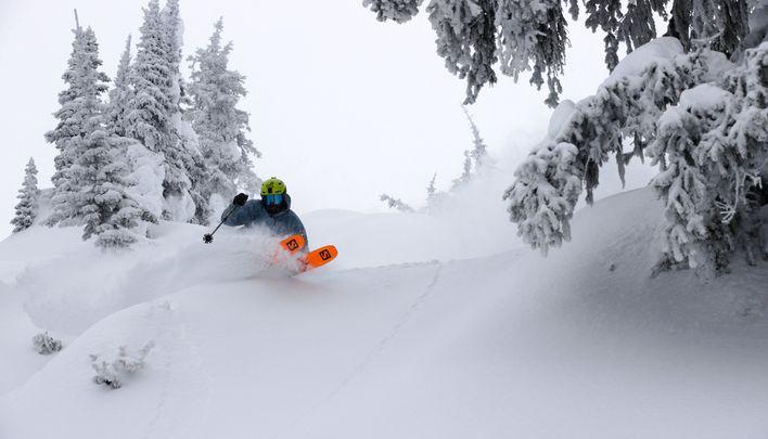 And this hill is most definitely not just a blue-square wonder. Riding up Falcon Chair, I survey the playground that Deans told me about over the phone, his excitement palpable and descriptions so vivid that I imagined something that more or less resembles what lies in front of me now: steep, gullies and faces, peppered with cliffs and stunted trees. Cotton clouds have gathered above the mountain, but a few stubborn rays of sunshine poke through, keeping the light sharp and clear. I pause to admire the rugged Monashee Mountains glistening to the north, then slide into the natural half-pipe at the top of Grizzly. I arc some lazy wall-to-wall turns before popping over the roll onto a funnel-shaped face of soft and forgiving moguls.