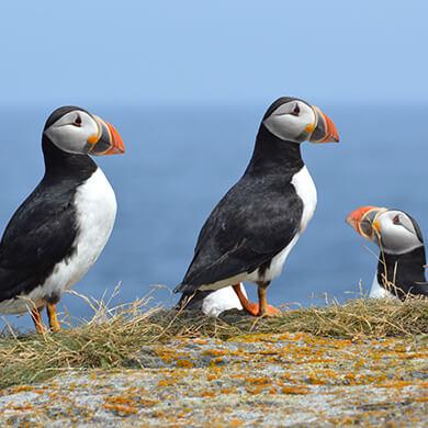 パフィンの日本名は、「西角目(にしつのめ)鳥」。目の周りの模様が「角」のようになっており、ニューファンドランド島の岬では、トコトコ歩く、愛くるしい姿を目にすることができます。キュートな野鳥と記念撮影すれば、自分が特別な笑顔になることに気づくでしょう。