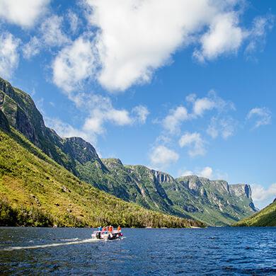 ニューファンドランド島の西岸に位置するユネスコ世界自然遺産「グロスモーン国立公園」は、数億年の地殻変動の様子を伝える国立公園です。観光船が進む湖は、およそ1万5千年かけて氷河が大地を削り取った痕跡です。左右にそびえ立つ断崖は高いところで700メートル以上。湖底までの深さを合わせると、氷河は900メートル近くも大地を抉りながら、ゆっくりと海に滑り落ちていったことになります。もう驚きと言うしかありません。