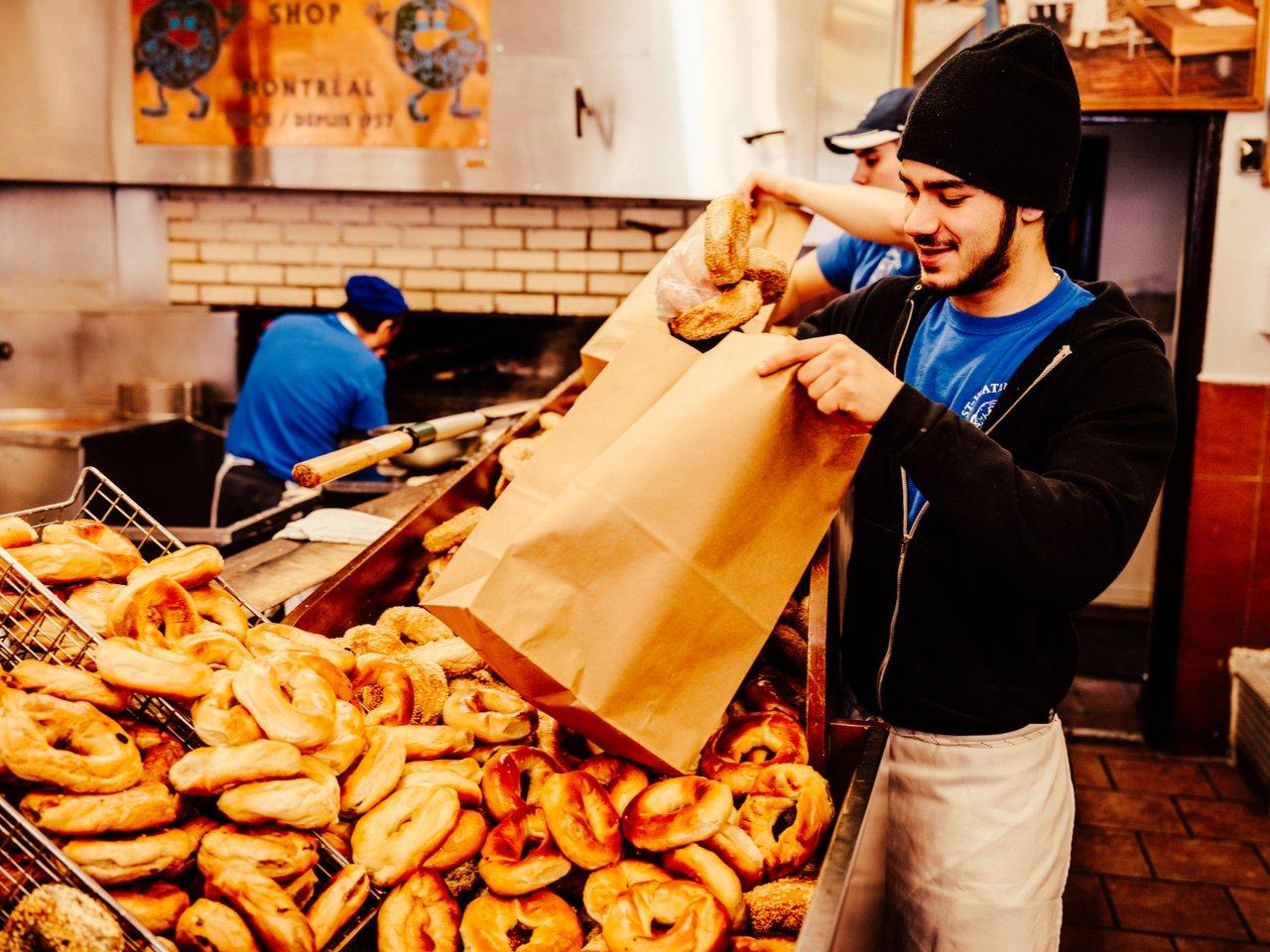 ベーグル:モントリオールで大人気の食べ物の1つがベーグル。18世紀に移民としてやってきたユダヤ人や東欧系の人々とともに持ち込まれました。モントリオール・ベーグルは、生地を蜂蜜シロップに浸し